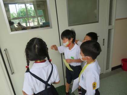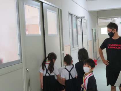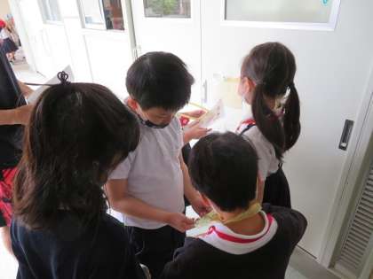 2年生が1年生を連れて学校探検をしました。家庭科室や音楽知る事務室、校長室、職員室などを回り、部屋の名前を1年生におしえていました。1年生は回った部屋にシールを貼るのがうれしかったようです。次の時間2年生は見つけたよカードに「1年生が楽しかったと言ってくれたのがうれしかったです。」「迷子にさせないように手をつないで回った」「「自分が1年生の時のことを思い出した。」などの感想を書いていました。