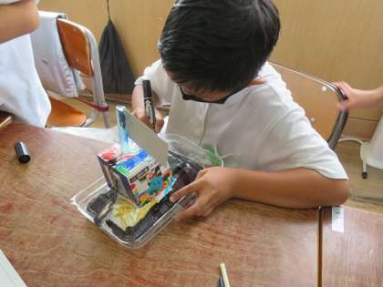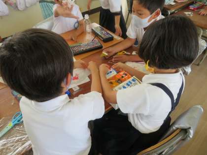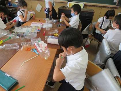 1.2年生が一緒に水遊びの準備をしました。みんなで集めた材料から選んで水遊びの道具をつくりました。船やさかな、たこ,亀水をすくう道具などみんなでたくさん作りました。さすが2年生は、手際よく作っていました。1年生に教えている子もいました。