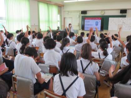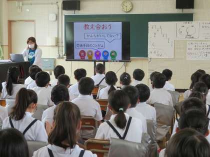 5年生がスマホの使い方について学習しました。ラインやチャットなど短い文や言葉だけを書くことで、誤解され友達関係が悪くなってしまうことがあったり、ゲームの対戦でどうしても勝ちたくて、時間を考えずに使ってしまい手生活のリズムが崩れ体調を崩したり、友達との関係が悪くなったりするということを映像を見て考えました。驚いたのは、スマホで知り合った人と会ったことある人と答えたこと子がいたことです。インターネットの中では名前や性別年齢などいくらでもうがつけます。そんな人と実際に会って事件に巻き込まれることもあることも学習しました。家庭でもスマホやインターネット、ゲームなどの使い方について話し合っていただきたいと思います。