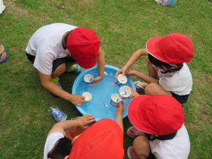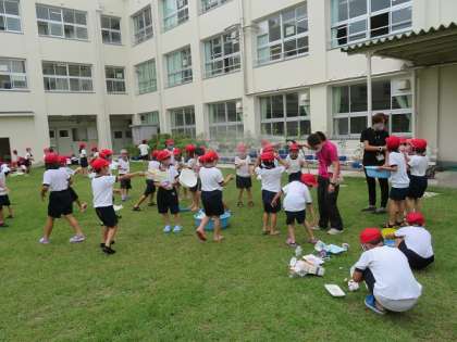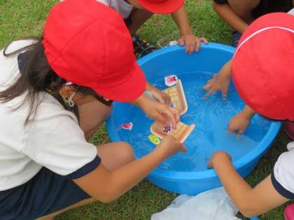 1・2年生が中庭で水遊びをしました。先日、自分たちで作った船や魚釣りの道具などをもっていきました。だんだんエスカレートしてたらいの水をかけ合う場面もありました。とっても楽しかったようです。帰りは疲れて荷物が重いと叫ぶ子もいました。