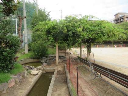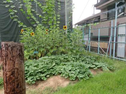 今年3月ごろから運動場北西を理科学習園として整備してきました。初めに畑の畝を3つ作り、ジャガイモを植えました。その後もう一つ畝を作りました。中庭の芝生の余ったものを百葉箱や瓢箪池の周りに敷き詰め根ずかせました。6月には畑にサツマイモ、ひまわり、へちまを植えました。夏休み中にひょうたん池のどろをさらってきれいにしました。瓢箪池にはまだ生き物はいませんが、メダカや金魚など理科学習で観察するものを育てたいと思っています。5月には藤の花もたくさん咲きました。今は、夕方になるとコオロギが鳴き始め昆虫も育っているようです。