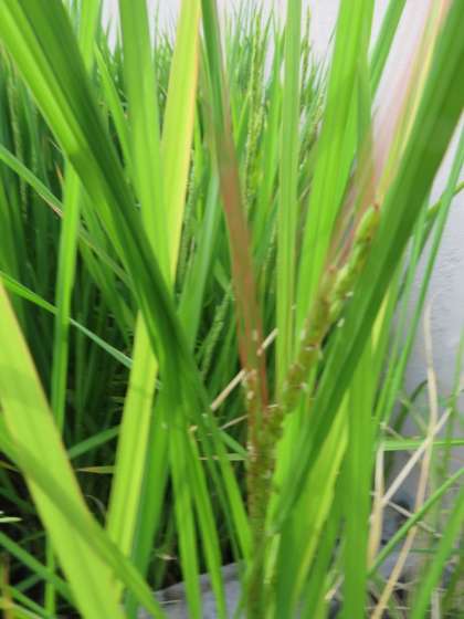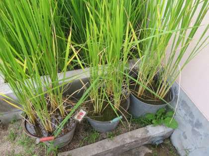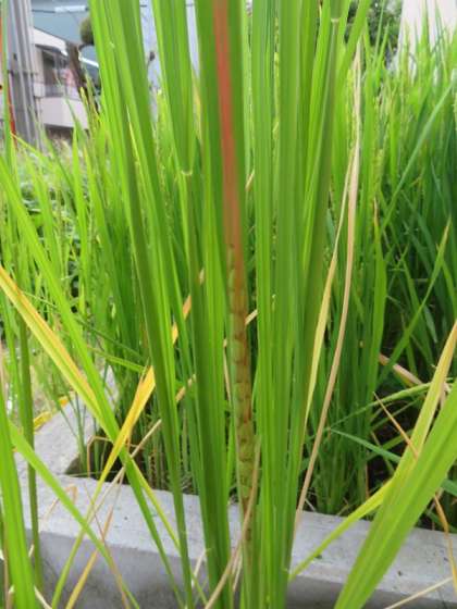 5月に住吉大社からいただいた稲で田植えをしました。今年は「赤米」という種類の苗ももらいました。その赤米の実ができてきました。穂の色が赤くなっているのがわかるでしょうか?赤飯のもとだったのかもしれませんね。