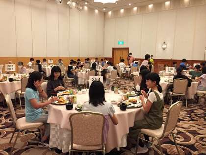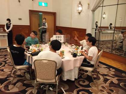 夕食です。ご飯はお代わり自由です。ハンバーグ、エビフライみんなの好きなものばかりです。