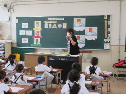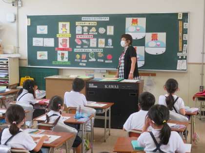 大領小学校の栄養教諭の平野先生が1年生の栄養指導に来てくださいました。赤・黄・緑の3つの栄養について学習しました。それぞれどんなものがあるかを絵を見ながら発表してプリントに書きました。初めてよその学校の先生に教えてもらって子どもたちはハイテンションでした。