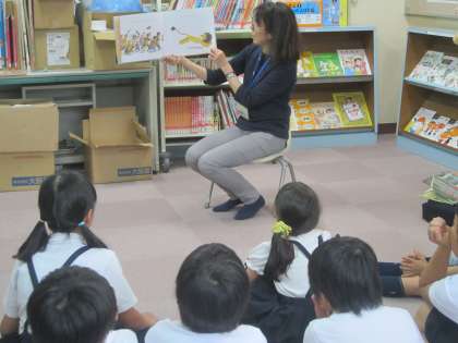 台風6号が接近し、外は雨脚が強くなってきました。ちょうど、学校図書館では、図書館ボランティアの皆様による「お話会」を開催しました。