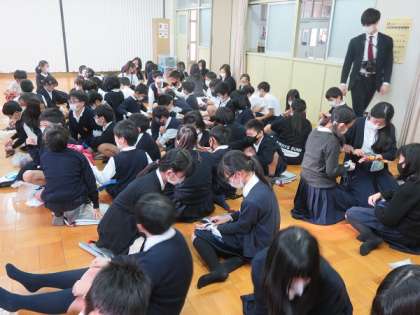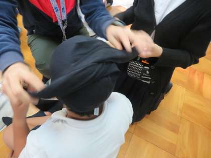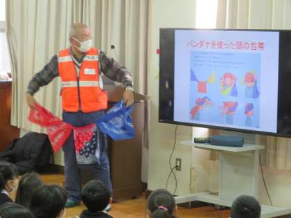 5年の防災教室を行いました。日本赤十字社の方に来ていただき、周りにあるもので応急手当をする方法を教えていただきました。バンダナで止血する方法やパンストやタイツを頭のにまく包帯代わりに使う方法などを実際にやってみました。あるものでということろが大切で、災害時に応急手当のものがそろっていることはありません。そのために身の回りにあるものを使っての応急手当てをする方法を身に着けておくことが大切だと思います。