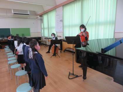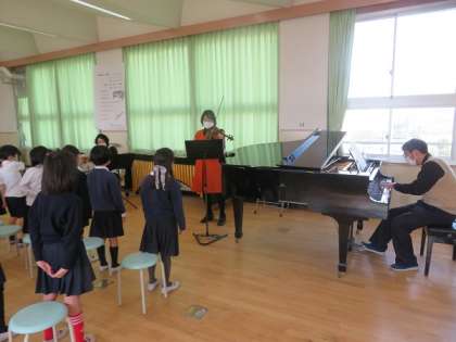 2年生の音楽鑑賞会を行いました打楽器奏者の前川さんとバイオリん奏者の袴田さんにお越しいただきました。「星にねがいを」をマリンバで演奏していただきました。柔らかなマリンバの音色がとても素敵でした。「道化師のギャロップ」は手の動きがとても速いのにおどろきました。「おもちゃのシンフォニー」では、鳩笛や水笛、ガラガラなども登場し楽しい曲でした。最後に「にじ」という曲で皆の歌とコラボしました。打楽器の音が体に響いてきて説いても迫力がありました。