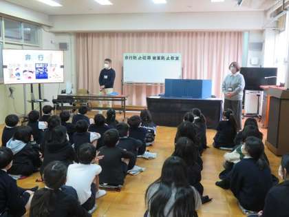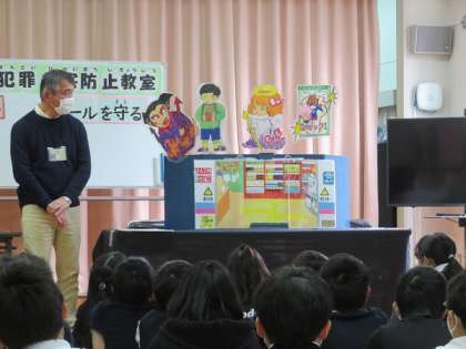 非行防止教室を行いました。警察OBの方に来ていただいて、喫煙がやがて薬物につながて行くケースについてお話いただきました。ペープサートを使って万引きについての話は、当事者や保護者、店の人の気持ちなどを交えた話で犯罪なんだということをしっかり話されていました。非行に走らないためには、断る勇気を持つことが大事だと話されていました。
