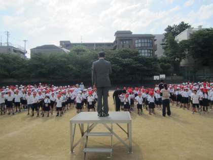 大阪NIE推進協議会から国語科、社会科などでご支援をいただく予定です。全校朝会でのお話でした。