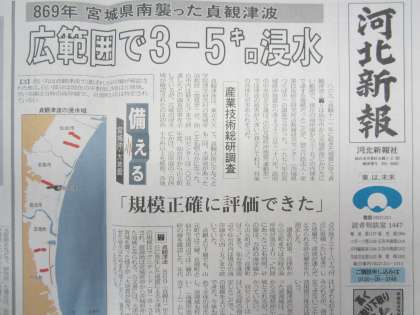 東日本大震災が発生するおよそ5年前の「河北新報」(平成18年6月12日付朝刊)では、869年(貞観11年)に発生した「貞観津波」の痕跡を調査した結果と政府・中央防災会議の見解を「河北新報」(仙台市)が一面トップで報道しています。
