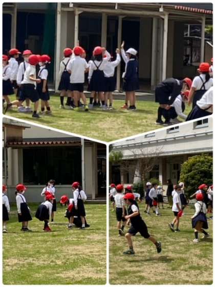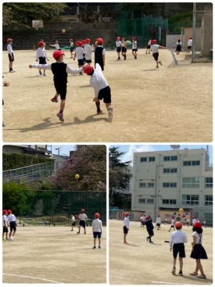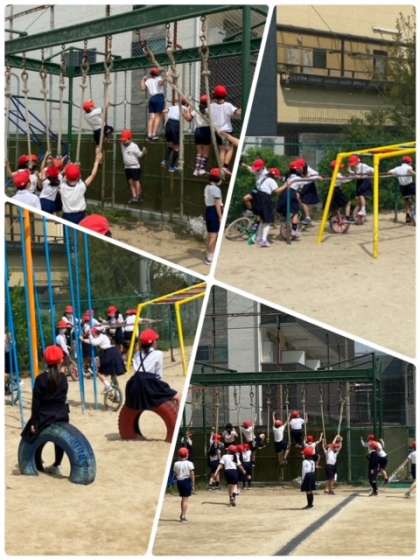 運動場や中庭に出てきて、身体を動かして楽しんでいます。ボールを使ったり、遊具を楽しんだり、芝生を駆け回ったりと、みんな楽しそうです。
