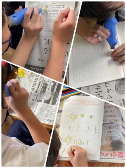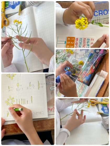 5年生が理科の学習として、アブラナの花を詳しく観察していました。