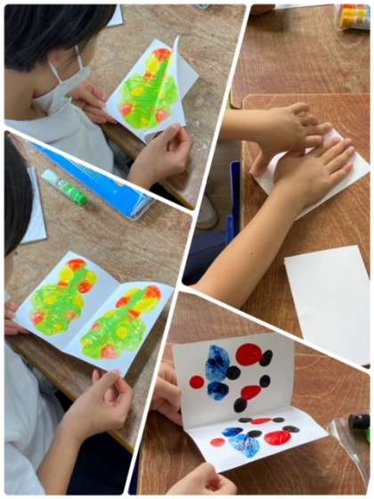 画用紙に直接絵の具を出して、それを二つ折りにして、広げてみると…。