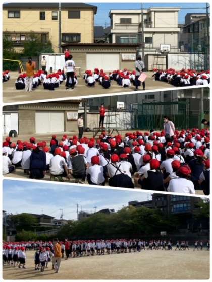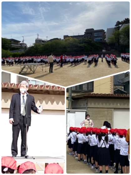 今日から全学年がそろっての児童朝会が始まりました。1年生も上手に整列して、しっかり話をきけていました。