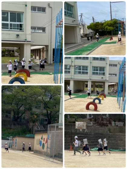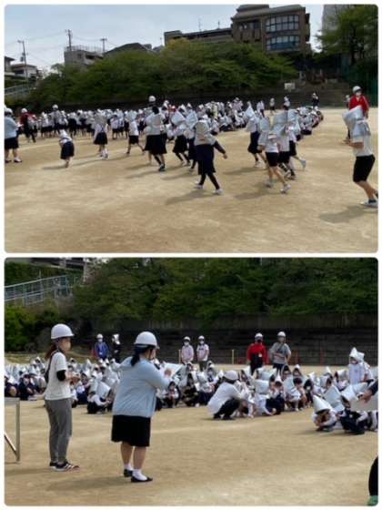 教職員はヘルメットをかぶり、子どもたちも防災頭巾をかぶって避難しています。初めての1年生は、戸惑いながらも真剣に参加できていました。