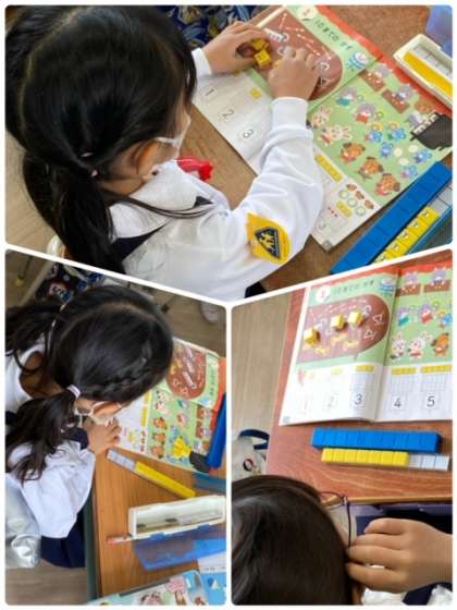 今日は算数の時間に、ブロックを使って、数について学んでいました。操作しながらよく考えていました。