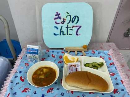 ビーフシチュー、きゅうりのサラダ、甘夏かん、コッペパン、イチゴジャム、牛乳