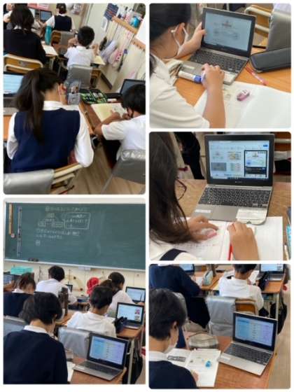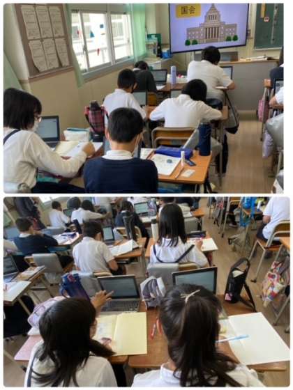 政治の仕組みについて、自分たちで学習者用端末を活用して調べてノートにまとめています。