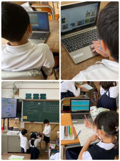 おたまじゃくしの様子の観察カードを記録していました。学習者用端末を活用してカエルについて調べてもいました。上手にカードにまとめることができています。