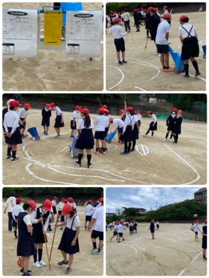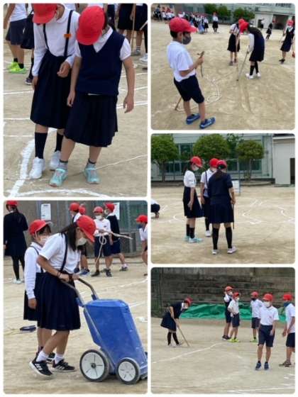 6年生全員で、運動場で作業をしています。設計図もある様です。何が出来上がるのでしょうか?