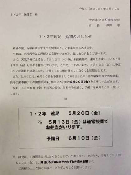 1、2年遠足 延期のお知らせ