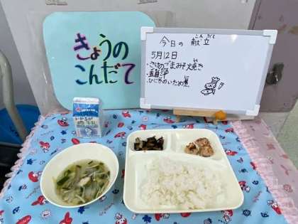 鮭の胡麻味噌焼き、五目汁、ひじきの炒め煮、ご飯、牛乳
