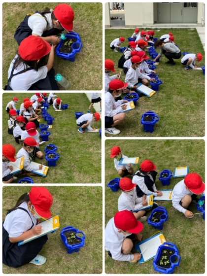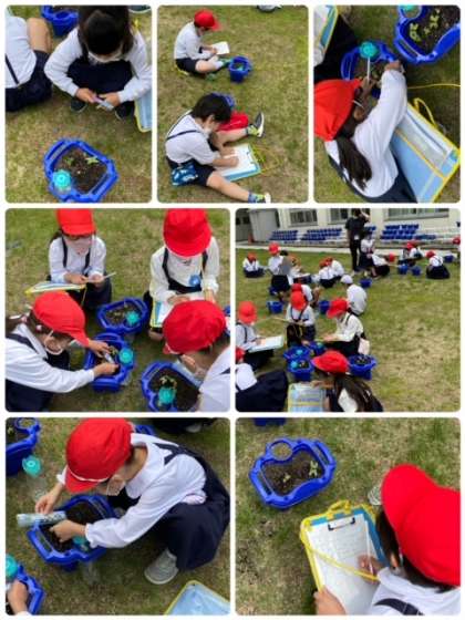 この週末で、芽が出ています。その様子をよく見たり、触ったり、長さを測ったりして、観察しています。