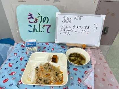 豚丼、湯葉のすまし汁、カボチャのしょうゆ焼き、牛乳