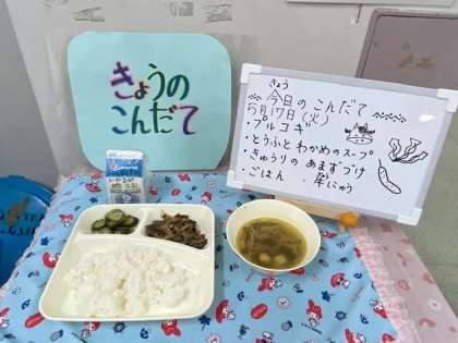 プルコギ、豆腐とわかめのスープ、きゅうりの甘酢づけ、ご飯、牛乳