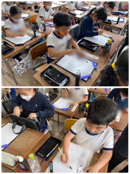 まずは、用具の名前、準備の仕方を丁寧に確認しました。次に、実際に硯に水を入れて、墨を磨りました。いよいよ、半紙に筆で字や絵を書くときです。汚さないように、姿勢に気をつけて書きました。水だったのに黒くなった!思ったより太く書けた!など、それぞれに感じることがあったようです。