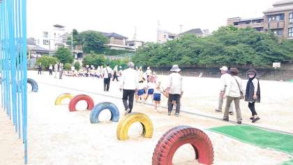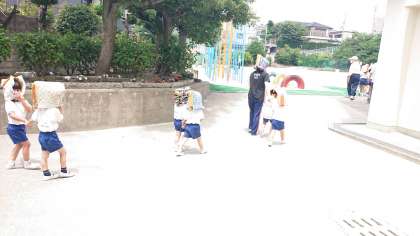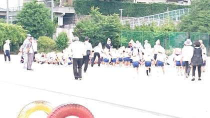 東粉浜幼稚園の震災避難訓練です。東粉浜地域のシニア会の皆さんと一緒に静かに落ち着いて避難することが出来ました。
