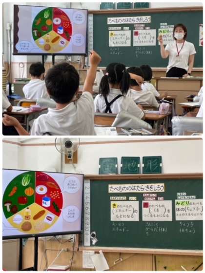 住吉小学校の栄養教諭の方にお越しいただき、2年生が栄養指導の授業を受けました。