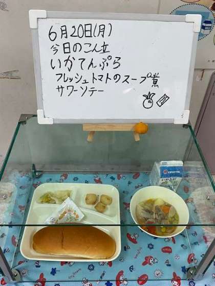 イカ天ぷら、フレッシュトマトのスープ煮、サワーソテー、コッペパン、アプリコットジャム、牛乳