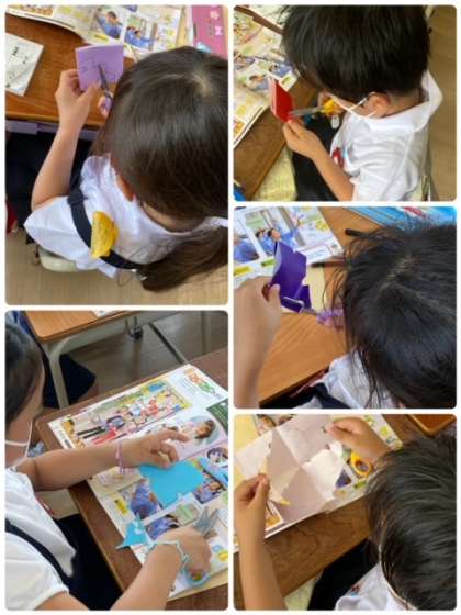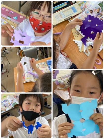 折り紙を折って、線を描いてそれを切り開いて、模様を楽しんでいました。