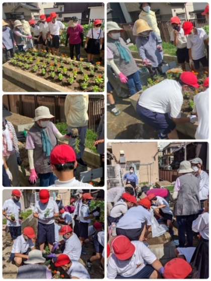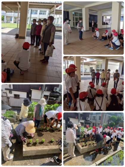 委員会の子どもたちと一緒に、学習園と玄関に置くプランターに、きれいに植え替えていただきました。