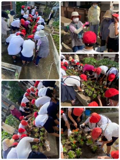 住吉区役所事業『花さかスミちゃん』のボランティア活動をされている方々5名が、園芸委員会の子どもたちに花の苗の植え方について、教えに来てくださいました。