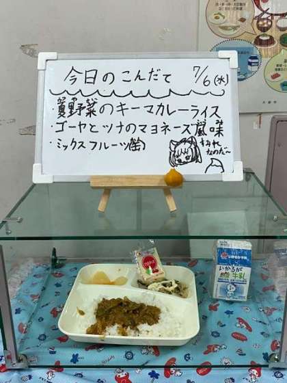 夏野菜のキーマカレーライス、ゴーヤとツナのマヨネーズ風味、ミックスフルーツ(缶)