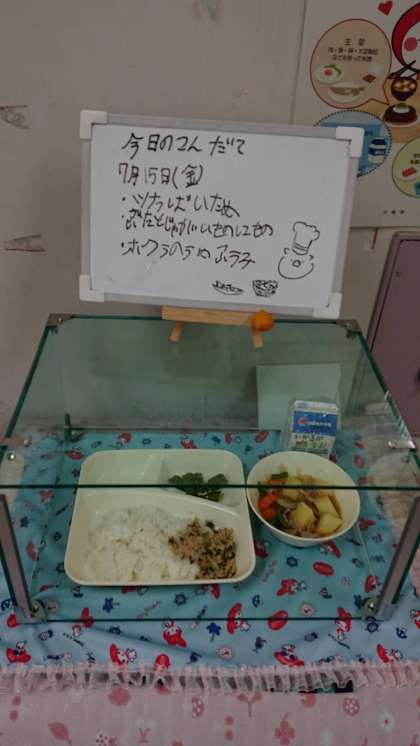 ツナっ葉炒め、豚肉とジャガイモの煮物、オクラの梅風味、ご飯、牛乳