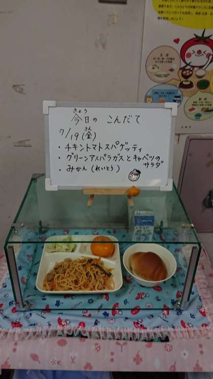 チキントマトスパゲッティ、グリーンアスパラガスとキャベツのサラダ、冷凍みかん、パン、牛乳