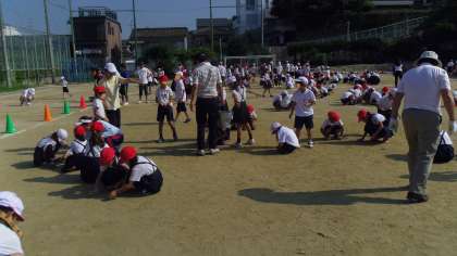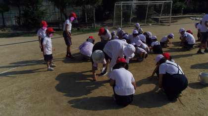 今日の朝会の時間、地域の永寿会(シニアの会)の方々と子ども達が運動場の石拾いをしました。