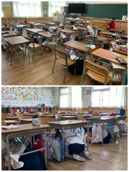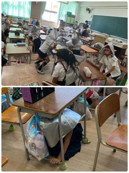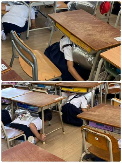 9月2日大阪880万人訓練が行われました。屋上の防災無線から流れる放送の指示で、全校児童が防災頭巾をかぶり机の下にもぐりました。