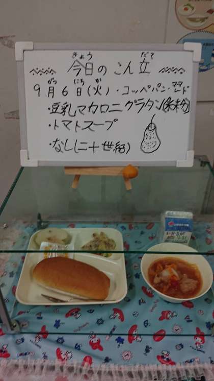 豆乳マカロニグラタン(米粉)、トマトスープ、コッペパン、梨、牛乳