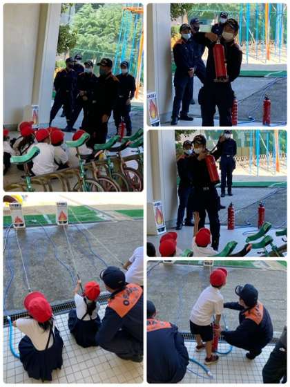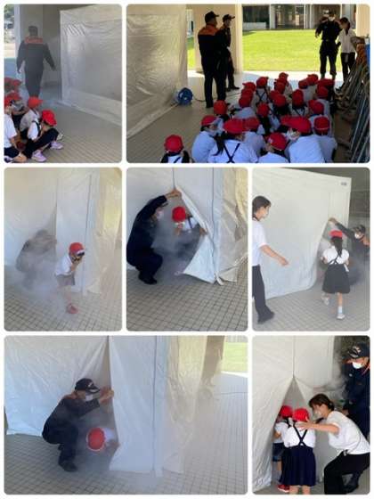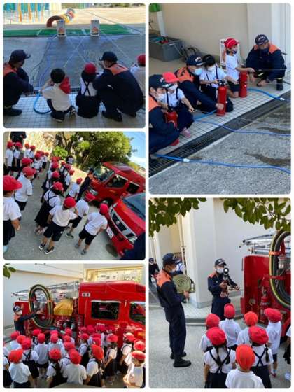 消防署の方に講師としてお越しいただき、火災時の避難訓練としての煙体験(この煙は無害です)、水消火器の練習をさせていただきました。また間近で消防車も見せていただきました。こういう経験が、万一の時にきっと役立つと思います。ご家庭でも話を聞いてみてください。