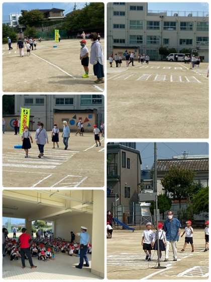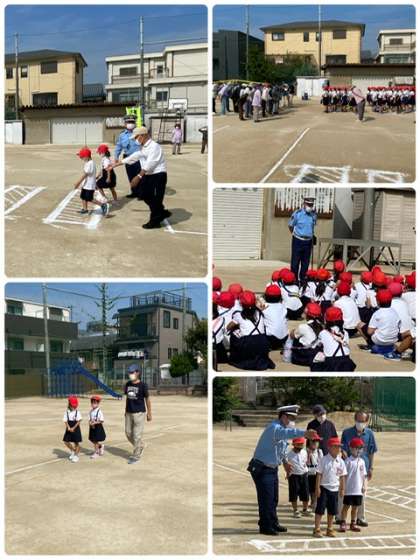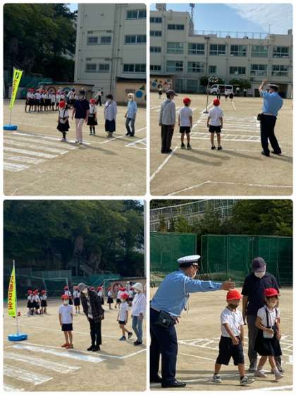 住吉警察署の方からお話を聞き、道路の歩き方、交差点の渡り方の学習をしました。信号機のある時とない時、両方練習しました。