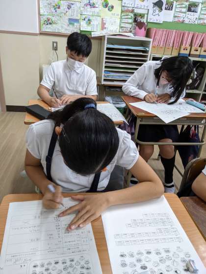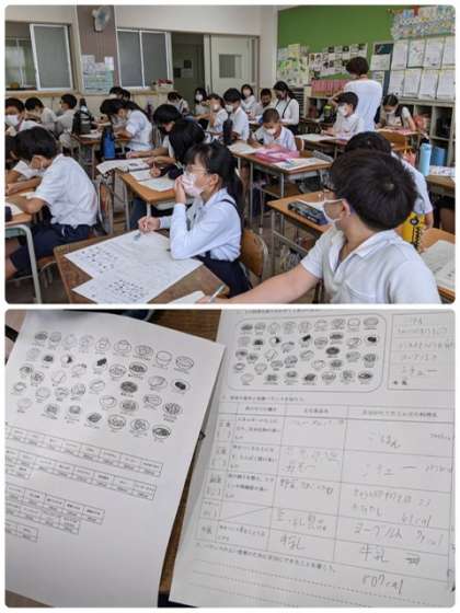 給食の基本と栄養バランスを知り、そこから主食・主菜・副菜を考えます。自分の献立を作り、カロリーを計算しました。バランスのよい食事を意識したいと思った児童が多数いました。