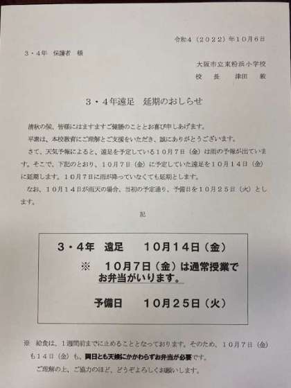 そこで、本日手紙を配布しますが、明日7日の遠足は来週14日に延期します。