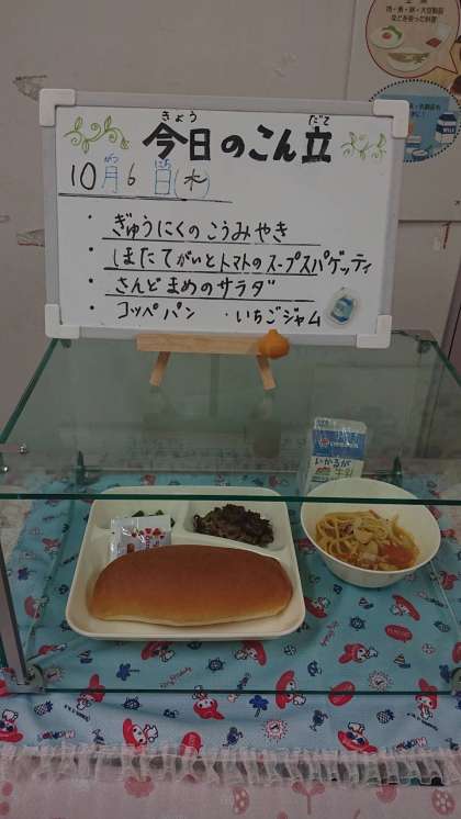 牛肉の香味焼き、帆立貝とトマトのスープスパゲッティ、三度豆のサラダ、コッペパン、イチゴジャム、牛乳