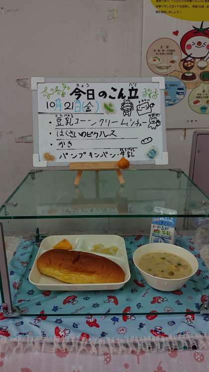 豆乳コーンクリームシチュー、白菜のピクルス、かき、パンプキンパン、牛乳です。