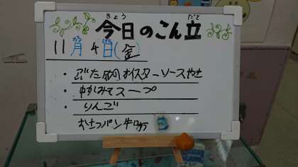 豚肉のオイスターソース焼き、中華味噌スープ、りんご、おさつパン、牛乳でした。