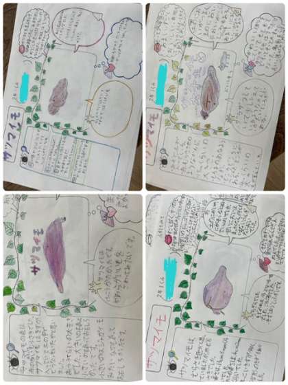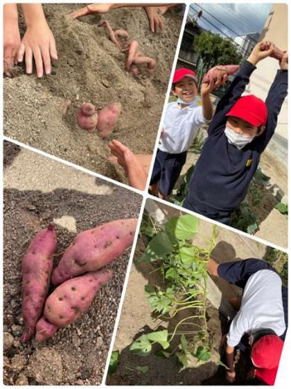 ?5月に苗を植え、水やりや草引き、つる返しなどのお世話をみんなでしてきました。収穫して、サツマイモをよく観察しました。また、みんなで作った蒸し芋は、とてもとてもおいしかったです!